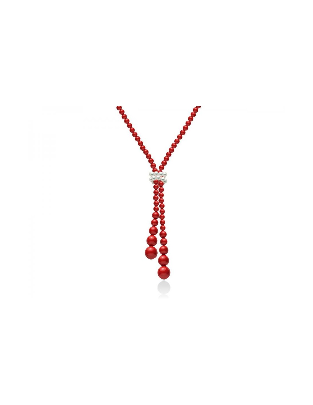 Collana Miluna della collezione Terra e Mare. Gioiello realizzato in agglomerato di corallo rosso di vari diametri e perle coltivate d’acqua dolce. Chiusura a moschettone in argento 925 con elemento in oro 750.