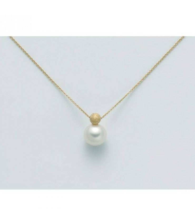 Collana da Donna di Miluna. Catenina in oro giallo 9kt, Perla sferica centrale di diametro 8-8,5 mm e sfera in Argento 925 con lavorazione diamantata