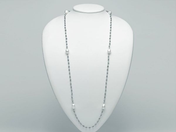 Collana in argento 925 con perle barocche di alta qualità coltivate bianche ø 11-12 e ematite dal color argento. Lunghezza collana da 110 cm fino a 112 cm sono presnti anellini di allungo vicino alla chiusura