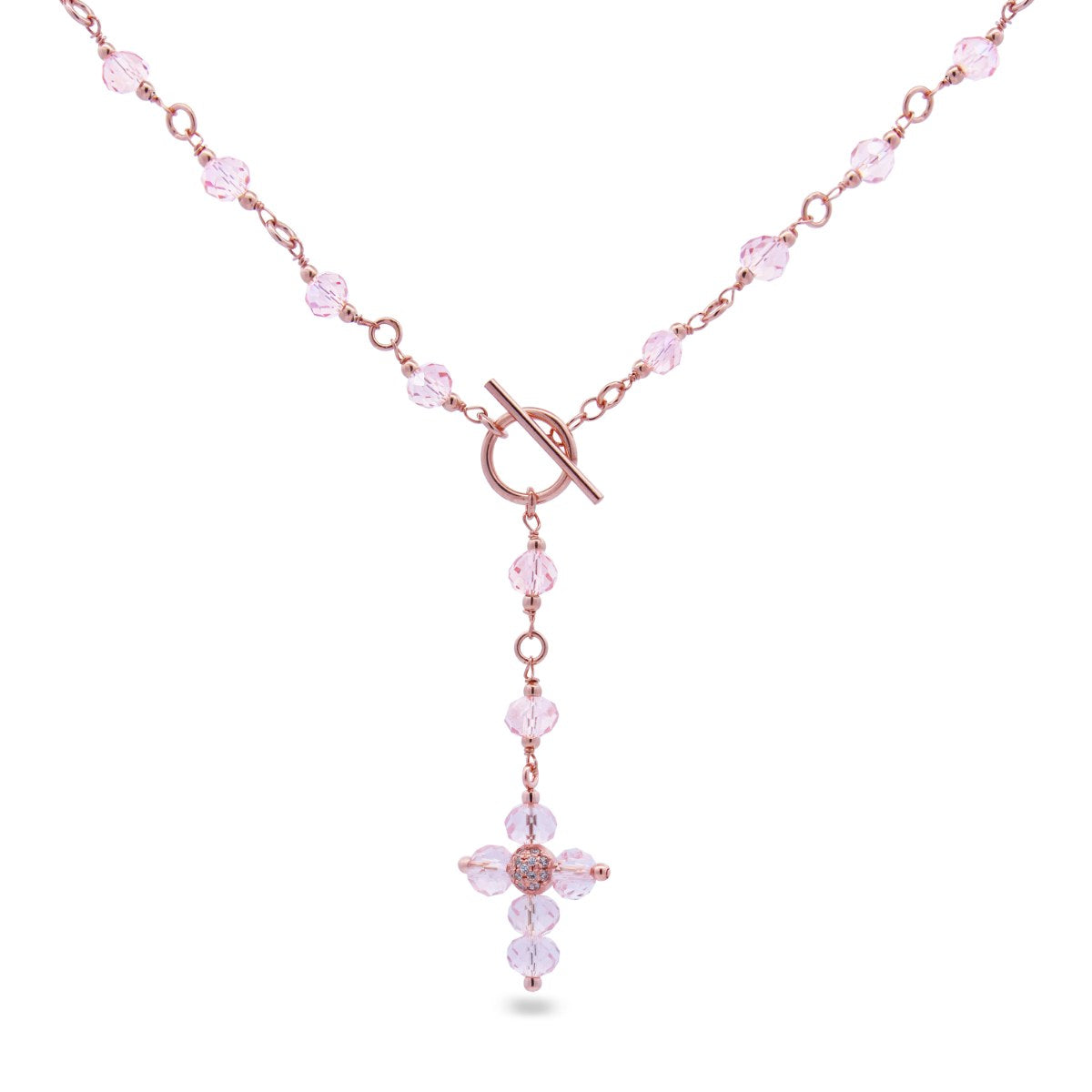 Collana con pendente della collezione Rue Des Mille Crystal Rainbow da donna. Colore: oro rosa e rosa. Il girocollo rosario è in argento 925‰ con galvanica in oro rosa 18Kt ed è impreziosito da cristalli di colore rosa e da un ciondolo a forma di croce che scende dalla chiusura a T-Bar. Lunghezza totale 50 cm.