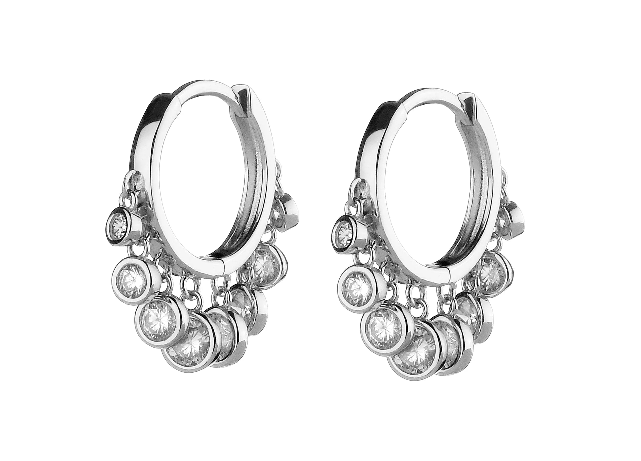 Orecchini con charms pendenti in zirconia cubica bianca di varie dimensioni, realizzati in argento 925 con galvanica rodio bianco.
