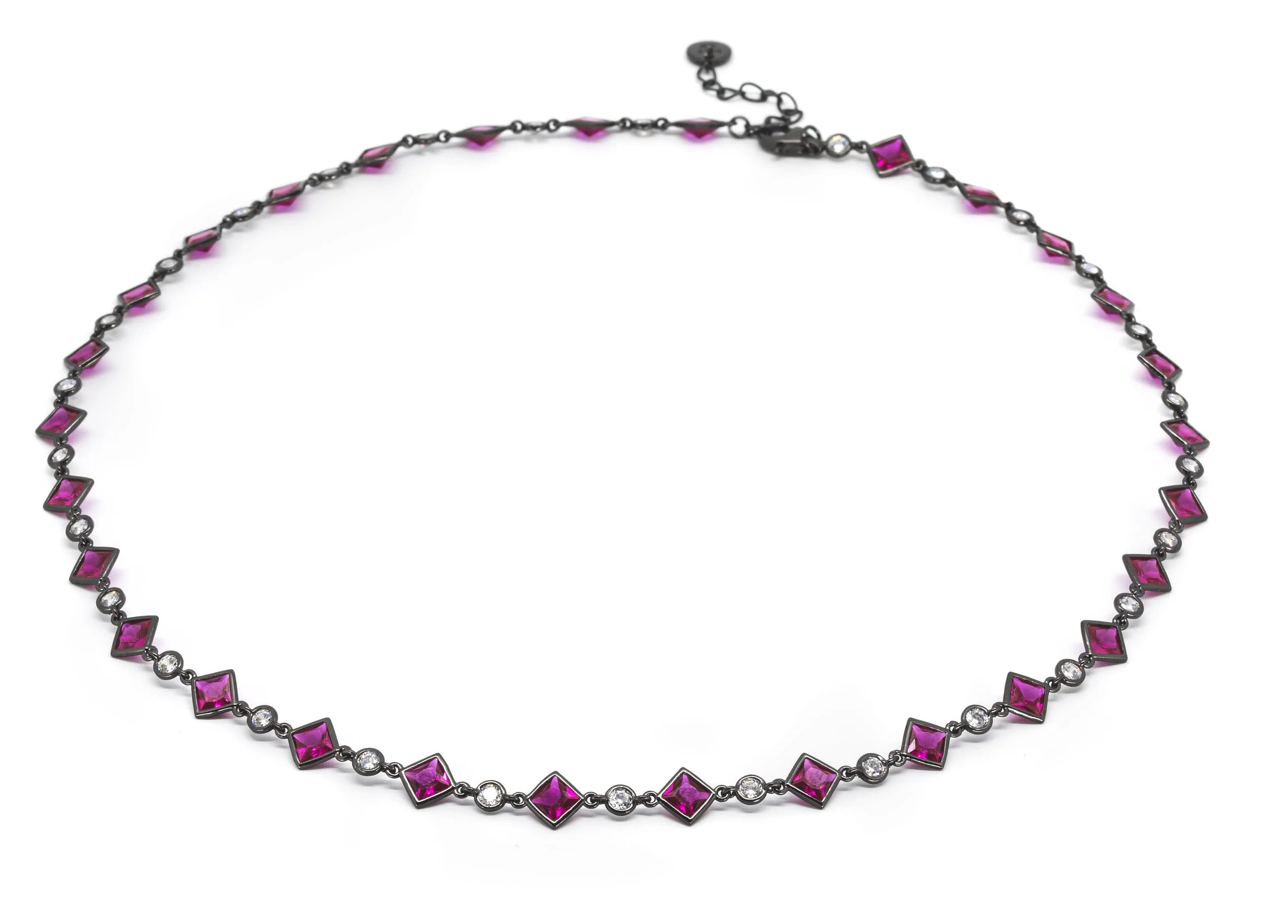 Girocollo con pietre taglio carrè in rubino sintetico e tonde in zirconia cubica bianca, realizzato in argento 925 con galvanica rodio nero.