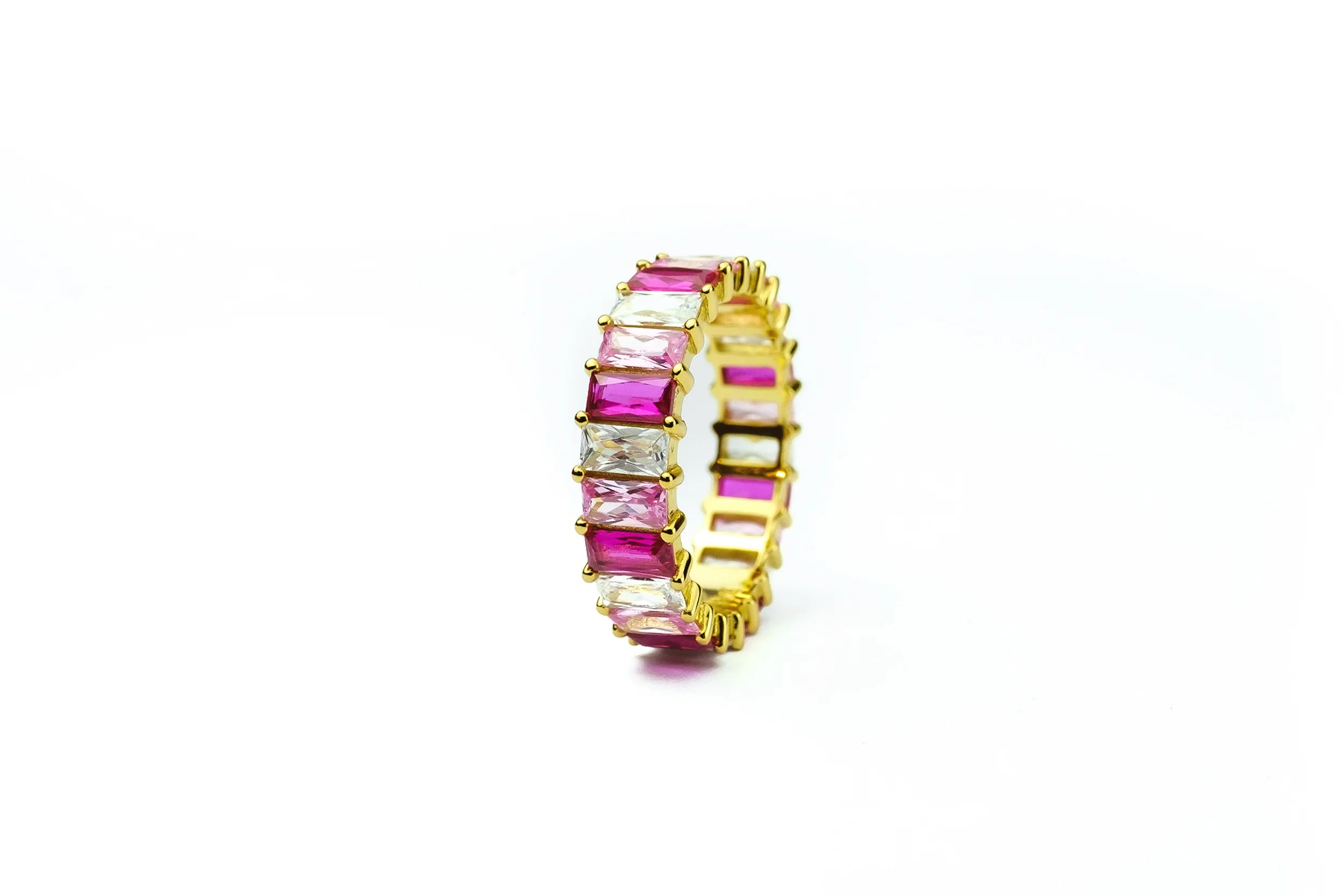 Fedina realizzata in Argento 925 con galvanica rodio giallo impreziosita da coloratissime pietre a taglio baguette con scalatura di colore rosso, rosa e bianco.