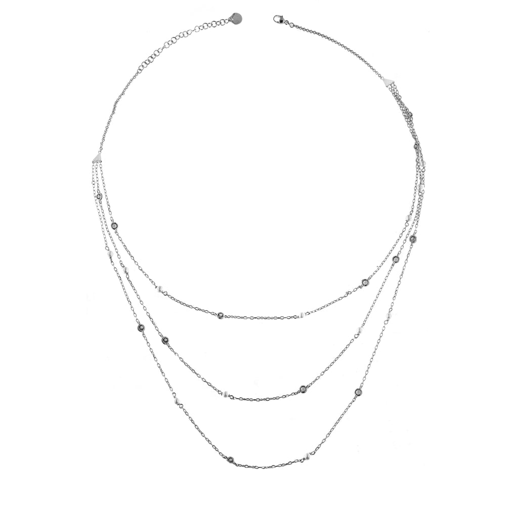 Girocollo con tre fili alternati di perle di conchiglia micro size e castoni di zirconi bianchi. I tre fili hanno lunghezze diverse e formano insieme un' unica collana.