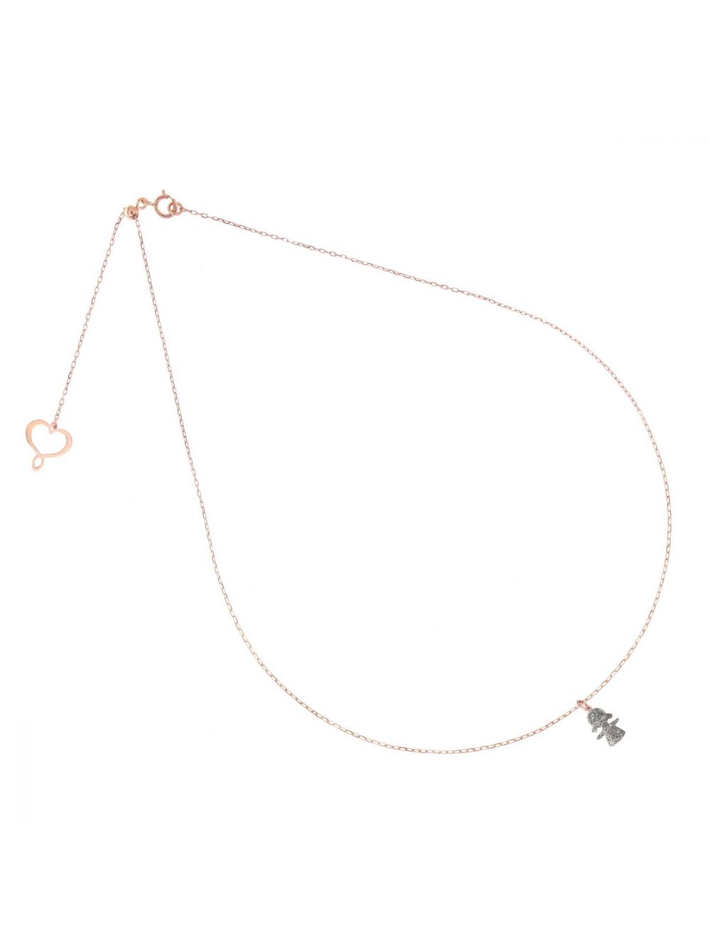 Girocollo Aurum con catena e lastra di bimbo con micro-polvere di diamanti cromo. Il gioiello è interamente realizzato in oro rosa 18 carati. La circonferenza può essere regolata grazie alla sfera scorrevole fino ad un massimo di 41 cm. Chiusura con anello a molla.