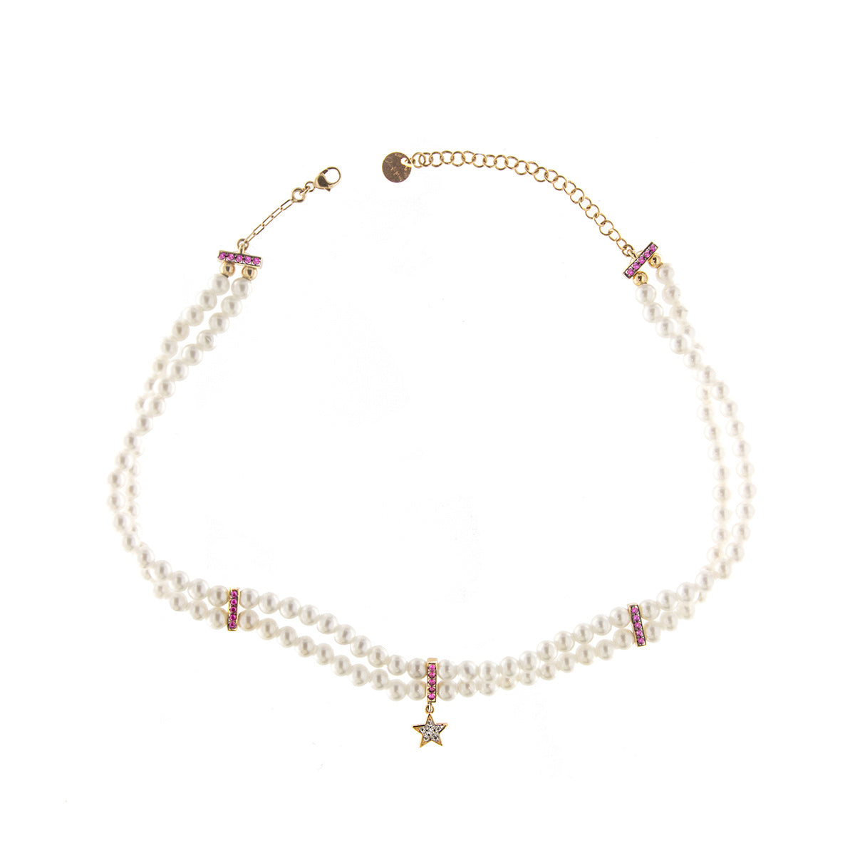 Girocollo elastico modello choker con due fili di perle di conchiglia uniti da cinque barrette di zirconi rossi, con una stella di zirconi bianchi nel centro.