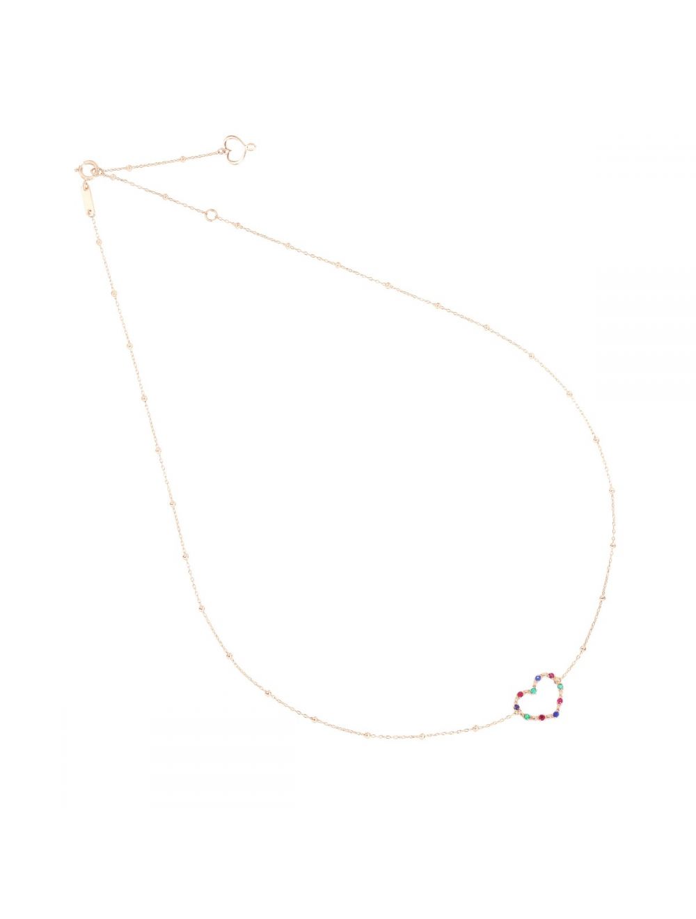 Girocollo Mon Coeur in oro 18 carati e cuore piccolo con diamanti. Il girocollo presenta una catena con piccole sfere. Sulla superficie del cuore sono presenti Zaffiri, Smeraldi e Rubini naturali e a una estremità della catena è presente un cuore Maman. La lunghezza del girocollo è regolabile in tre misure. Chiusura con anello .