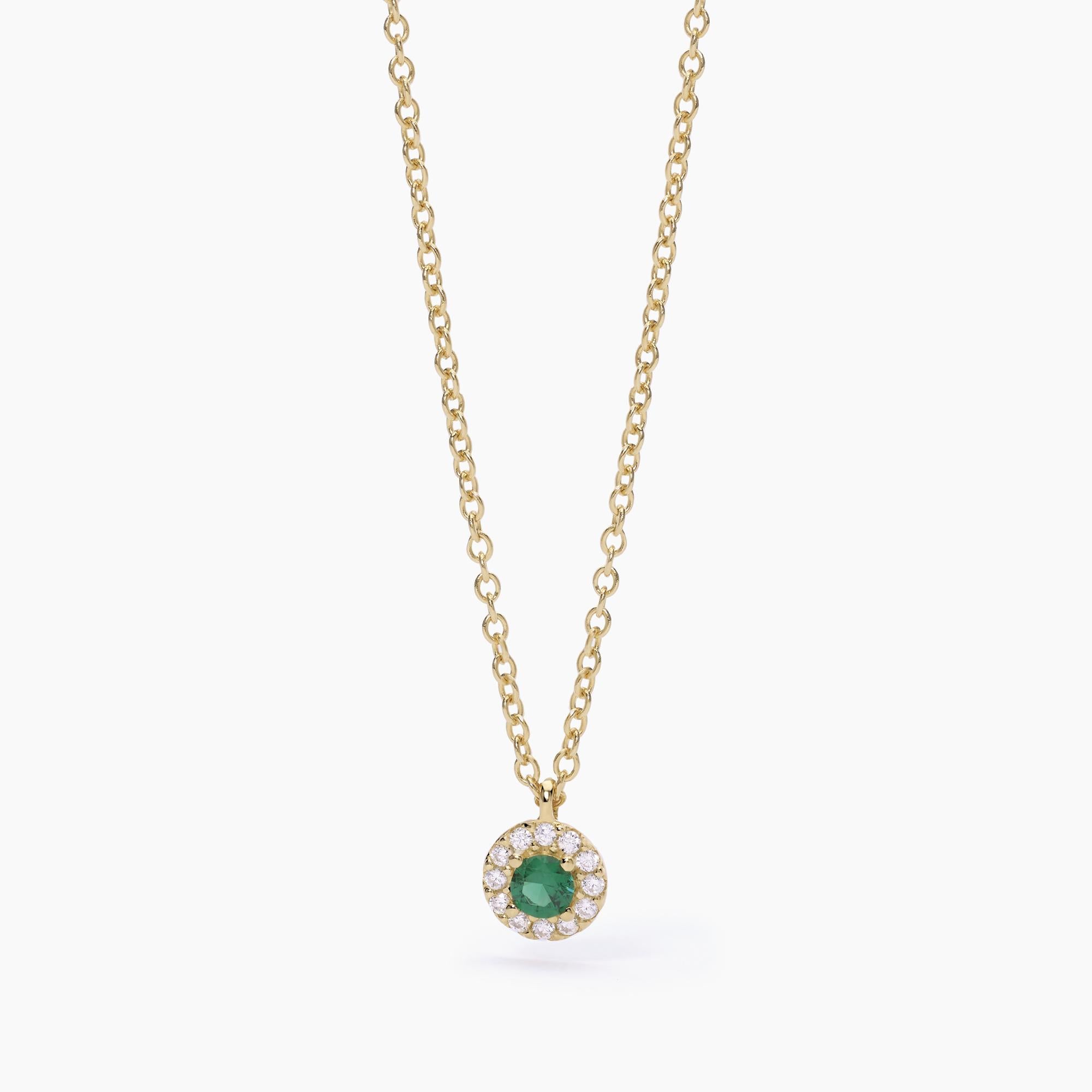 Girocollo in argento placcato oro 18k con catena forzatina. Ciondolo rotondo con smeraldo sintetico e zirconi.