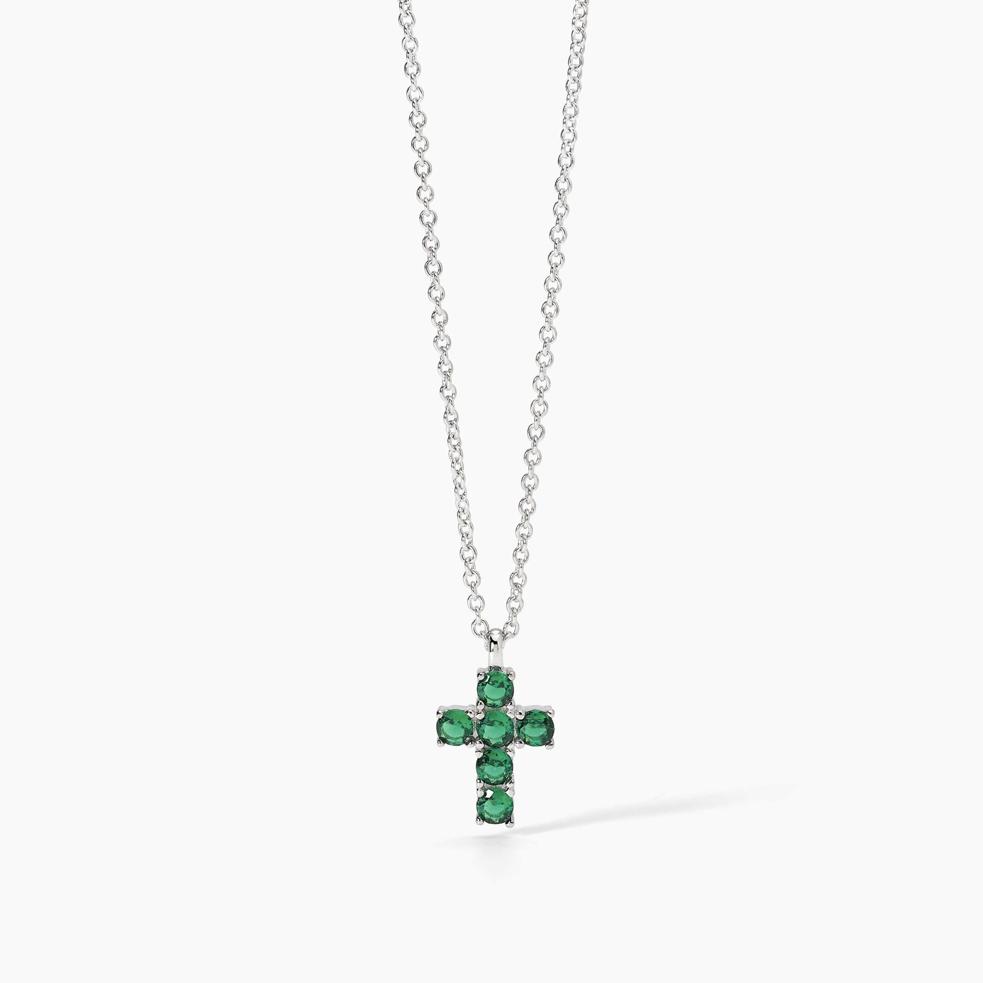Girocollo regolabile da donna in argento rodiato con catena forzatina, ciondolo croce e smeraldi sintetici.