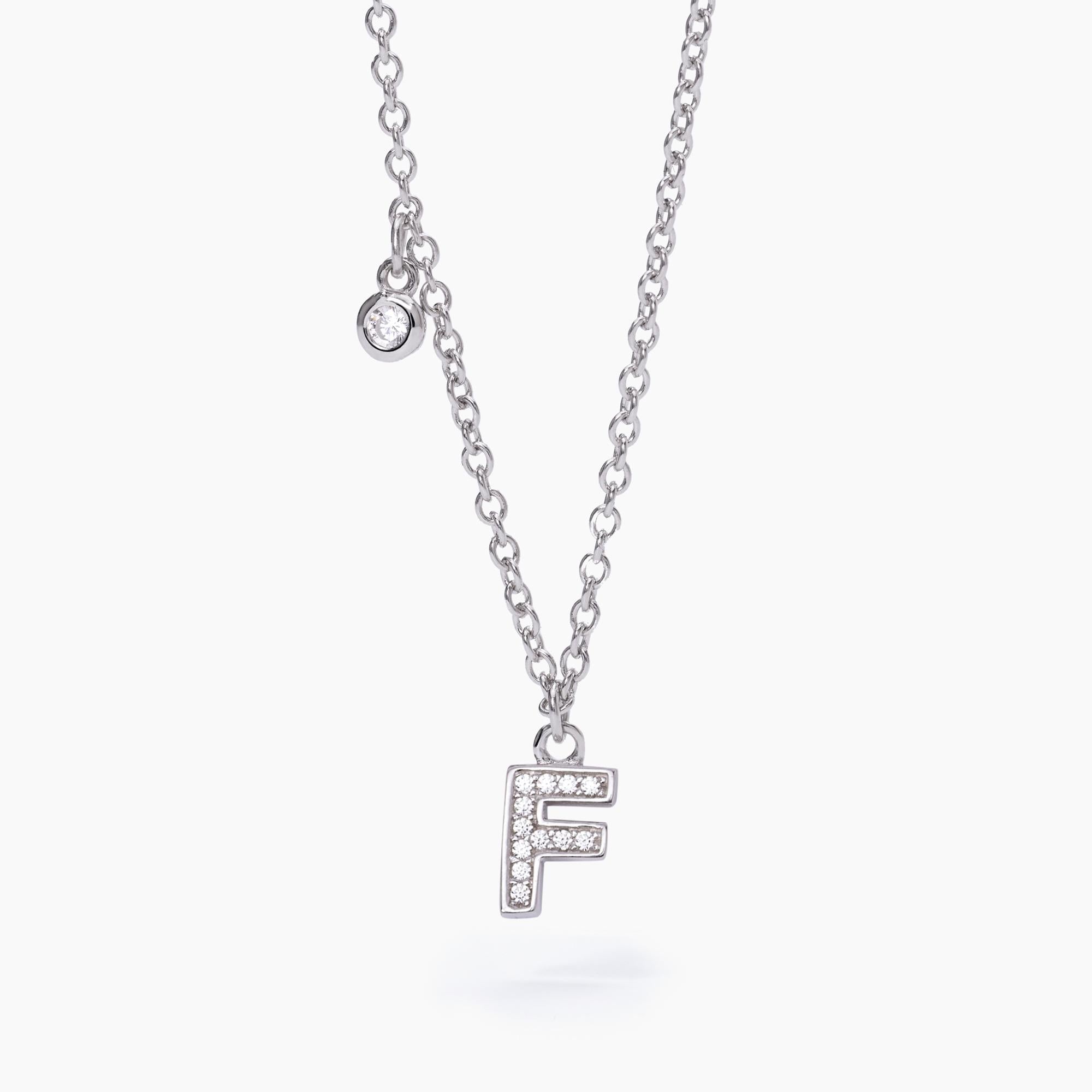 Girocollo in argento con catena forzatina e ciondolo a forma di lettera F con zirconi.