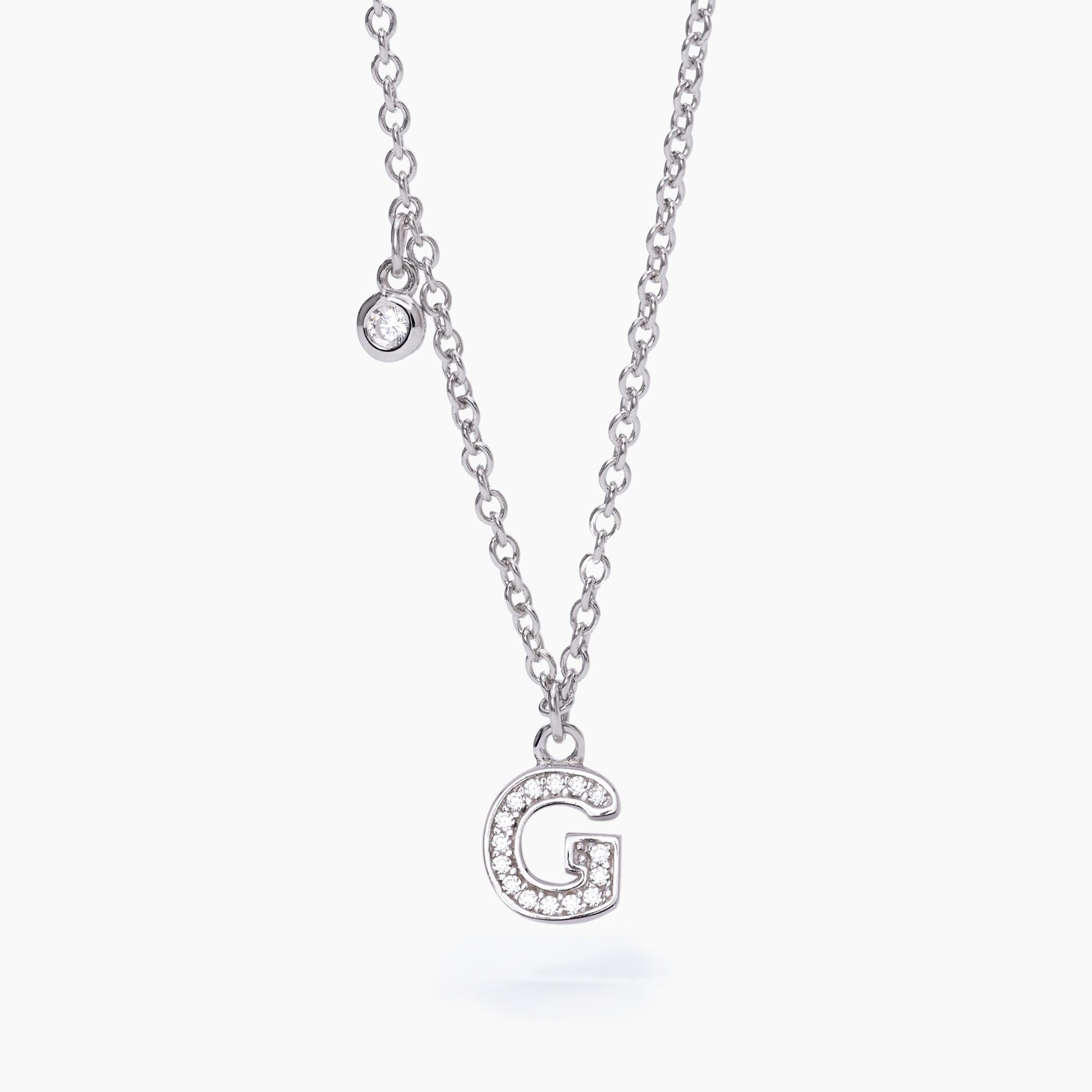Girocollo in argento con catena forzatina e ciondolo a forma di lettera G con zirconi.