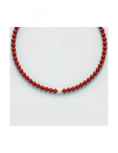 Filo di Perle Corallo Miluna Terra e Mare in agglomerato di corallo rosso, n.1 perla barocca bianca vera 8,5-9 mm centrale. Lunghezza: 40 cm