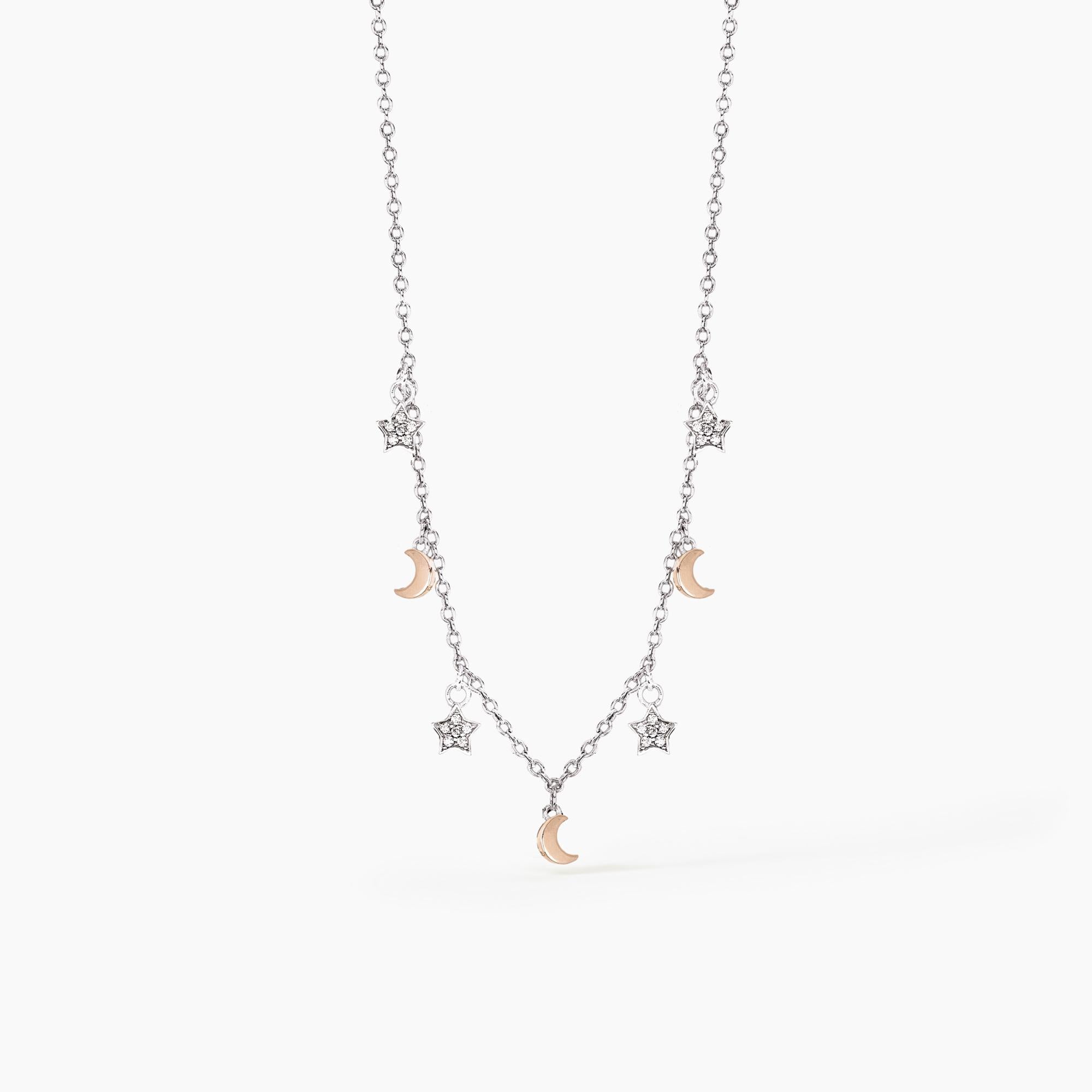 Girocollo in argento bicolore con ciondoli alternati a forma di luna e a forma di stella in pavé di zirconi.