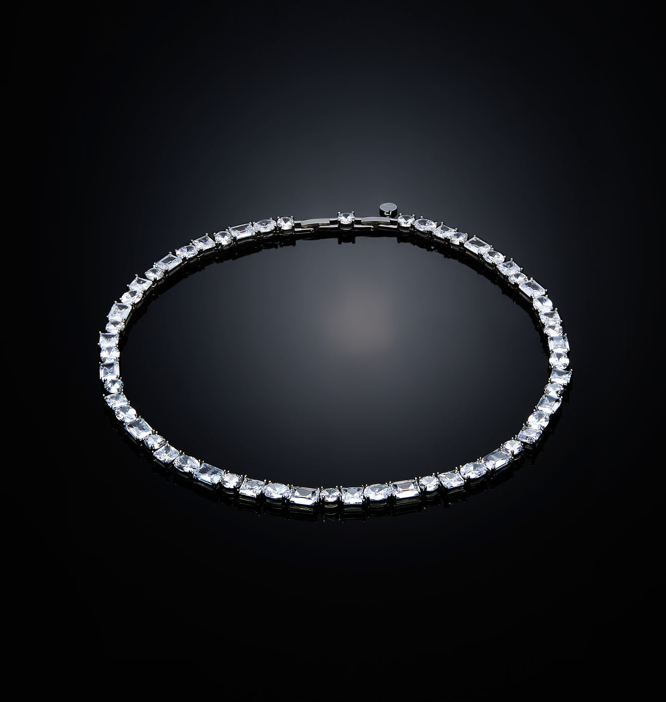 Girocollo con zirconi bianchi placcati in rodio. Le pietre sono caratterizzate da diversi tagli: rotondo, quadrato, ovale e smeraldo.
