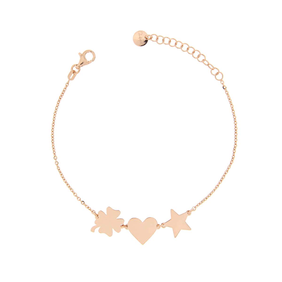 Bracciale catenella con 3 soggetti stella, quadrifoglio e cuore Argento Ramato 925