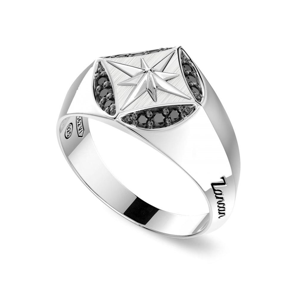 Anello da uomo Zancan in argento con spinelli neri, della collezione Insigna 925 Gioiello realizzato in argento 925 ipoallergenico, peso 5.6 gr Anello chevalier con Rosa dei Venti contornata da spinelli neri naturali