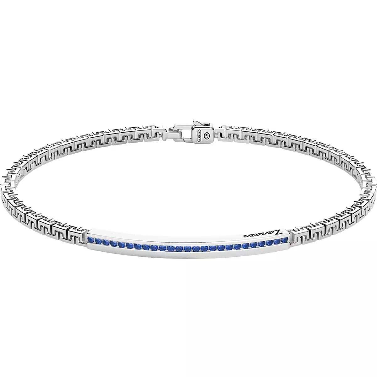 Il bracciale da uomo Zancan EXB729-BL della Collezione Insignia 925 è realizzato in argento 925 con con maglie greca e la sezione centrale quadra a binario è percorsa da una fila di spinelli blu.