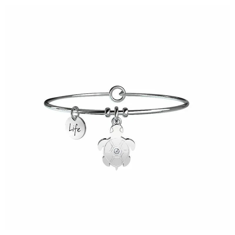 Nuota senza fretta in acqua e cammina lenta sulla terra: ha scoperto come allungare le stagioni della vita e accorciare la distanza dalla conoscenza. Tienila con te e illuminerà il tuo cammino, passo dopo passo. Bangle in acciaio con ciondolo Tartaruga. • Incisione e cristallo sul ciondolo • Chiusura tonda • Misura unica, diametro 6 cm • Materiale: Acciaio 316L, Cristallo