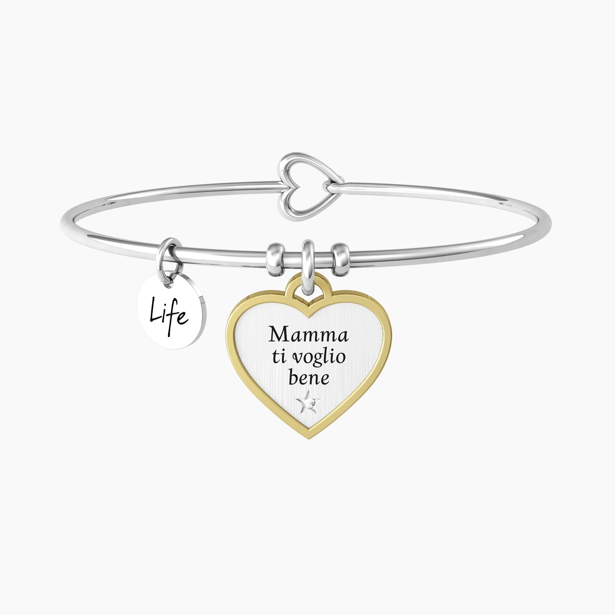 Bracciale rigido della collezione Kidult Family da donna. Colore: argento e oro. Bangle in acciaio inossidabile 316L con ciondolo satinato a forma di cuore e bordo rifinito in pvd oro con cristallo a stella. Incisione smaltata sul davanti "Mamma ti voglio bene" e sul retro "Per ogni cosa speciale che hai fatto per me". Dimensione del cuore: 19,9 x 19,4 mm. Misura unica con chiusura a cuore. Designed in Italy by Kidult.