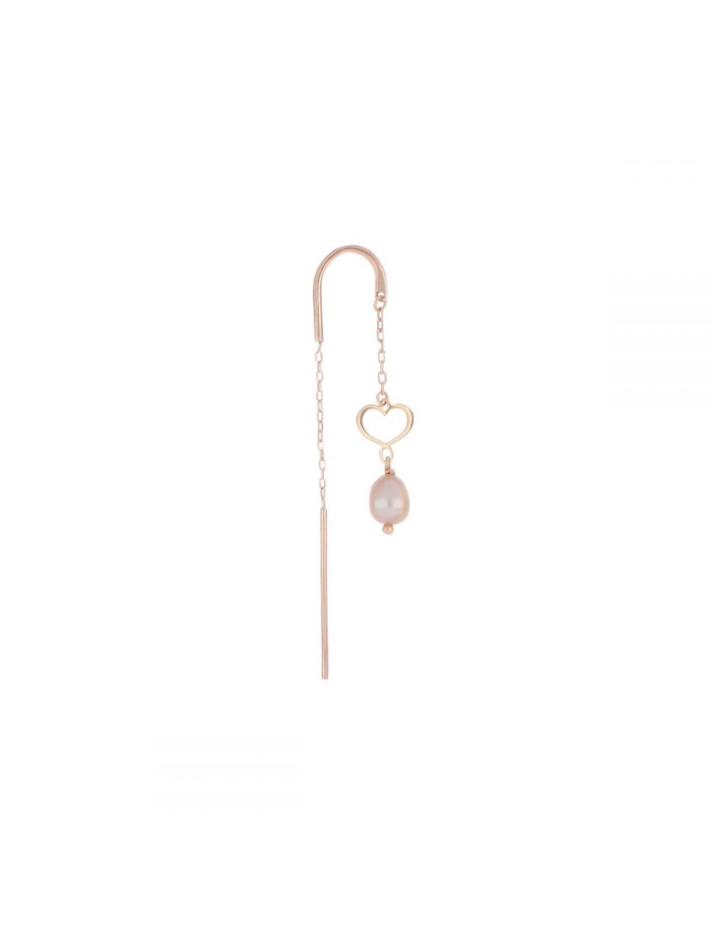 Orecchino ad ago singolo realizzato in oro rosa 18 carati con cuore Maman traforato e perla rosa ovale pendente di 5 mm x 6 mm. L'orecchino, visto frontalmente, è lungo circa 5 cm.