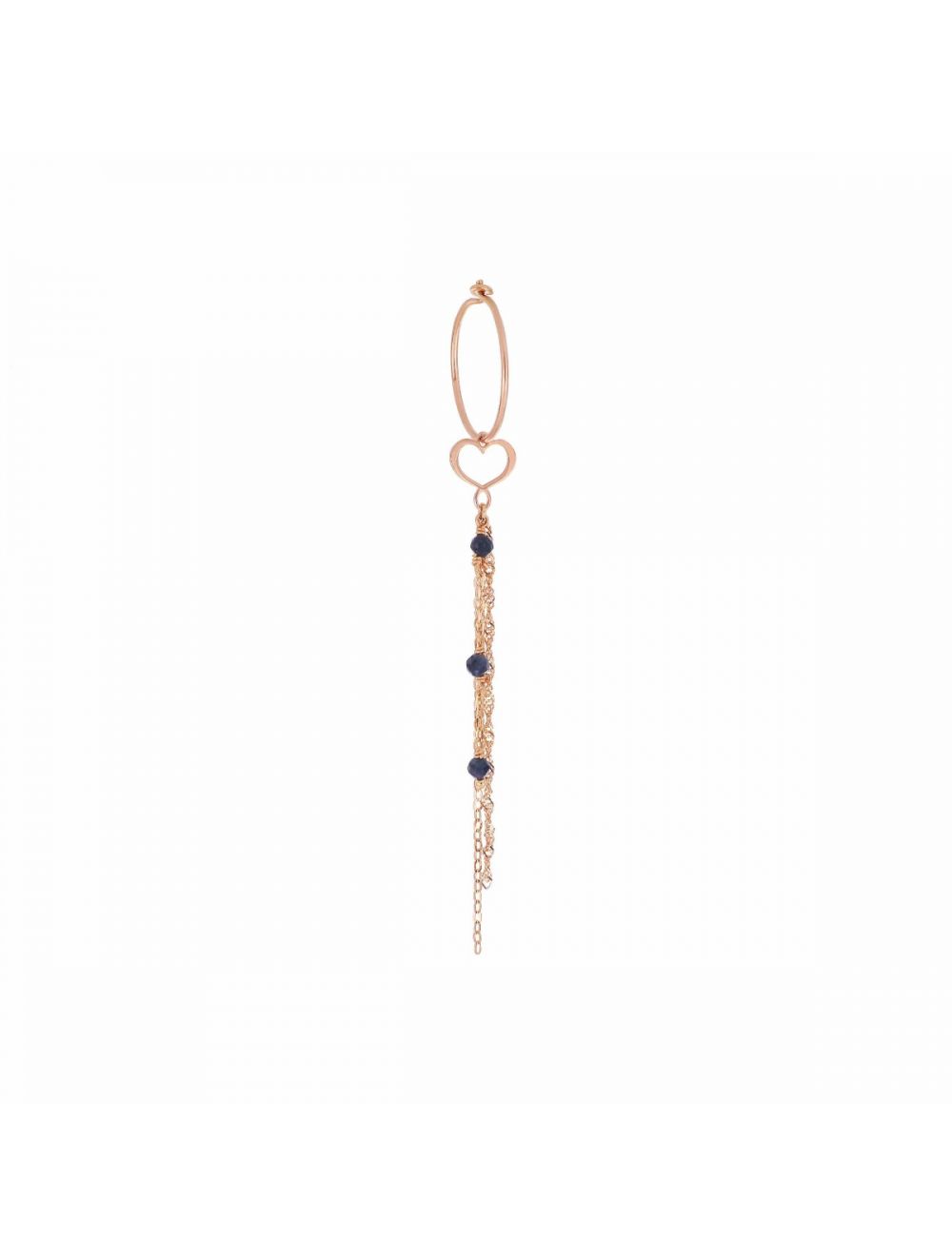 Orecchino a cerchio singolo realizzato in oro rosa 18 carati con cuore Maman traforato e cascata di catene e rosario di Zaffiri blu. Il cerchio misura 13 mm di diametro e l'orecchino è lungo complessivamente 58 mm.