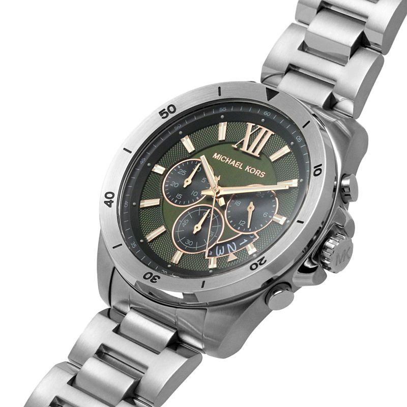 Orologio cronografo in acciaio inossidabile con finitura mista di colore argento. Cassa rotonda, vetro trasparente, quadrante verde. Cinturino in acciaio con chiusura deployante.