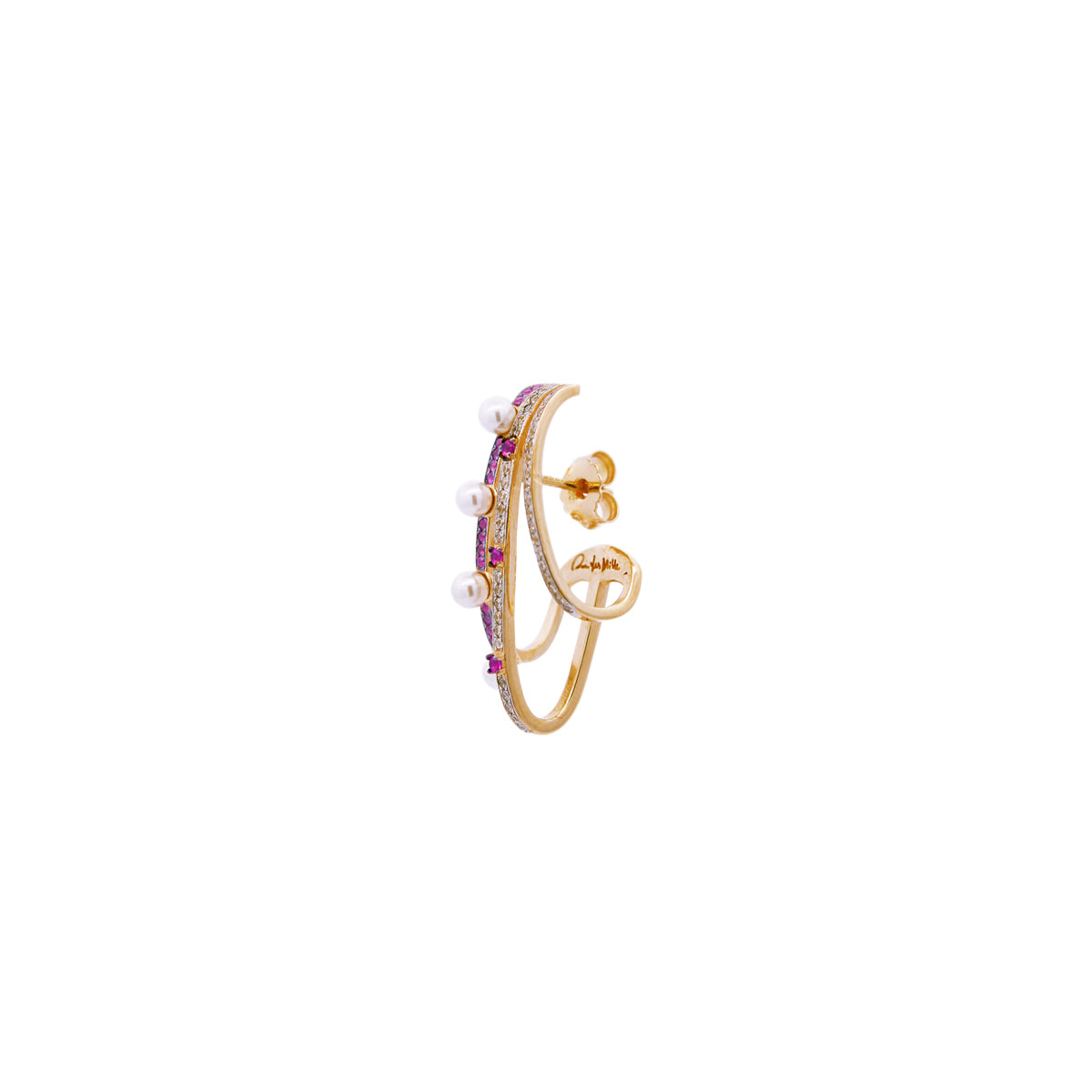 Mono-orecchino huggie con tre fili di zirconi bianchi, rossi e perle di conchiglia micro size. L'orecchino ha il perno centrale e i tre fili di zirconi e perle "abbracciano" il lobo.