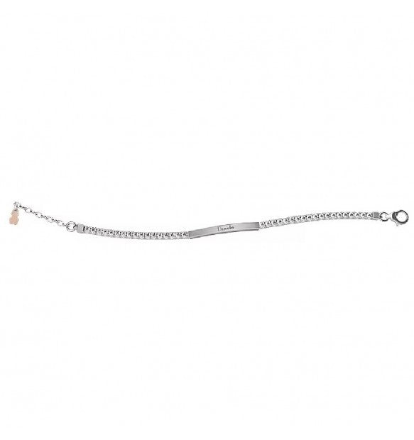 Braccialetto da bimba realizzato in argento 925%. Tennis di zirconi bianchi con targa centrale incidibile e orsetto pendente placcato oro rosa alla chiusura. Lunghezza massima di 16 cm. Chiusura con moschettone.