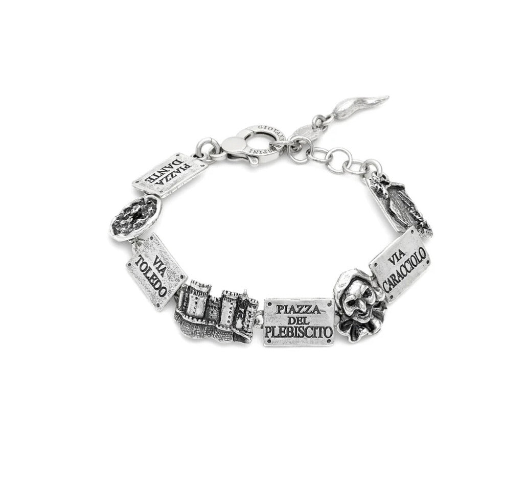 Vedi Napoli e poi muori... La città di Masaniello è raccontata da questo bracciale in argento brunito di Giovanni Raspini. La pizza, il Maschio Angioino, Pulcinella, via Toledo e il Vesuvio si fanno meravigliose microsculture da indossare ogni giorno con gioia e sfrontatezza.