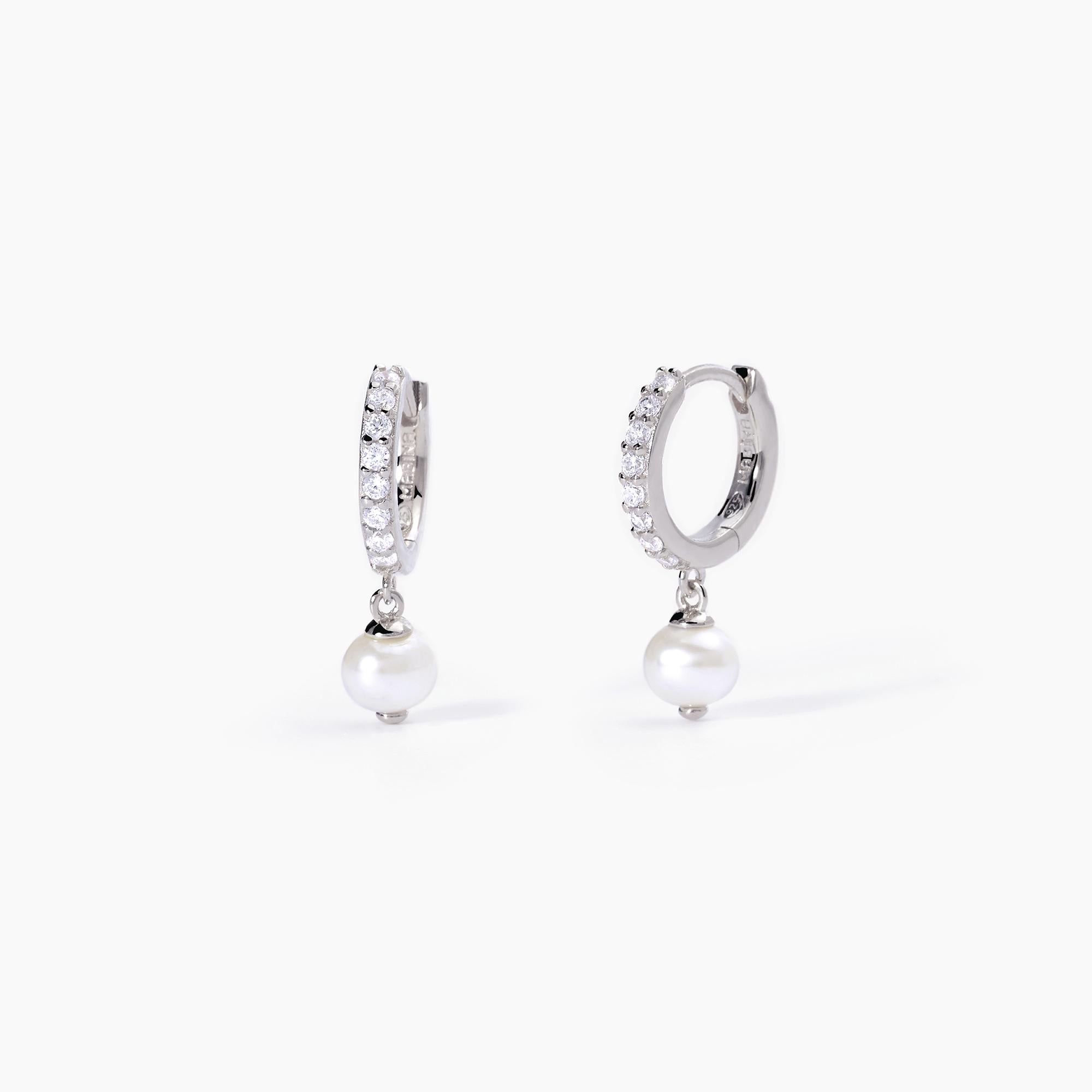 Orecchini da donna a cerchio in argento rodiato con perle coltivate pendenti e zirconi bianchi.
