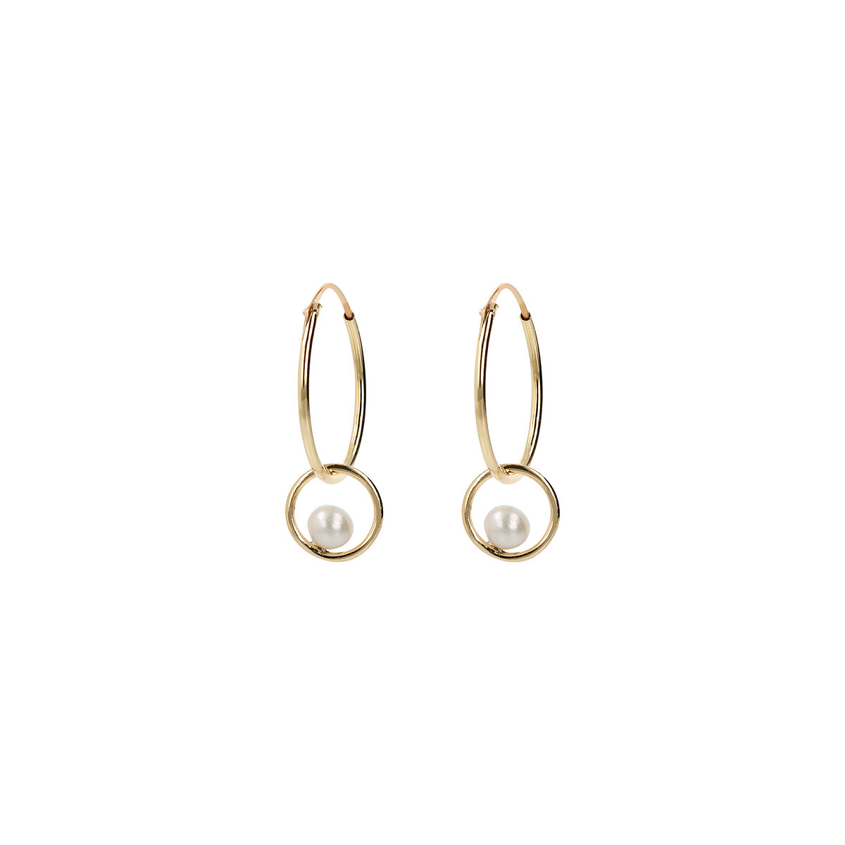 Orecchini a cerchio in Oro 375/1000 impreziositi da due anelli pendenti con al centro due perle tonde bianche coltivate d'acqua dolce; chiusura a baionetta.