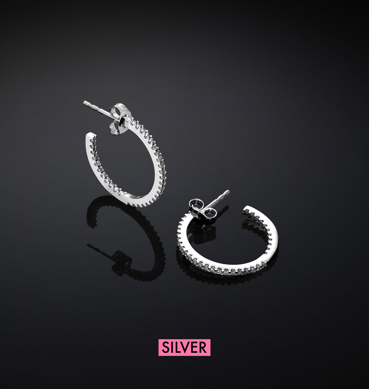 Orecchini a cerchio realizzati in argento 925 con un pavé di zirconi bianchi.