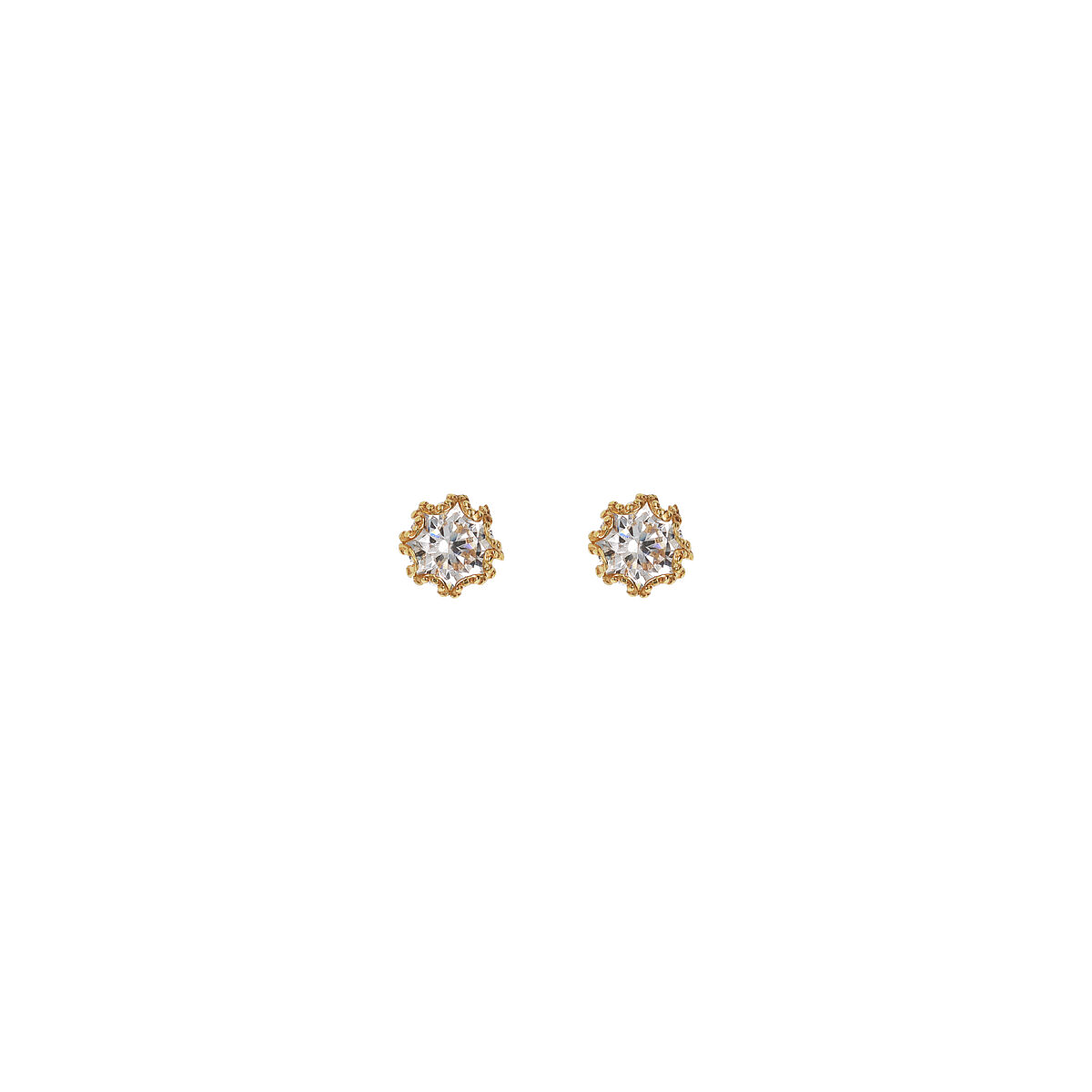 Orecchini a lobo in Oro 375/1000 con punto luce centrale in cubic zirconia, qualità luminosa; chiusura a perno e farfalla.