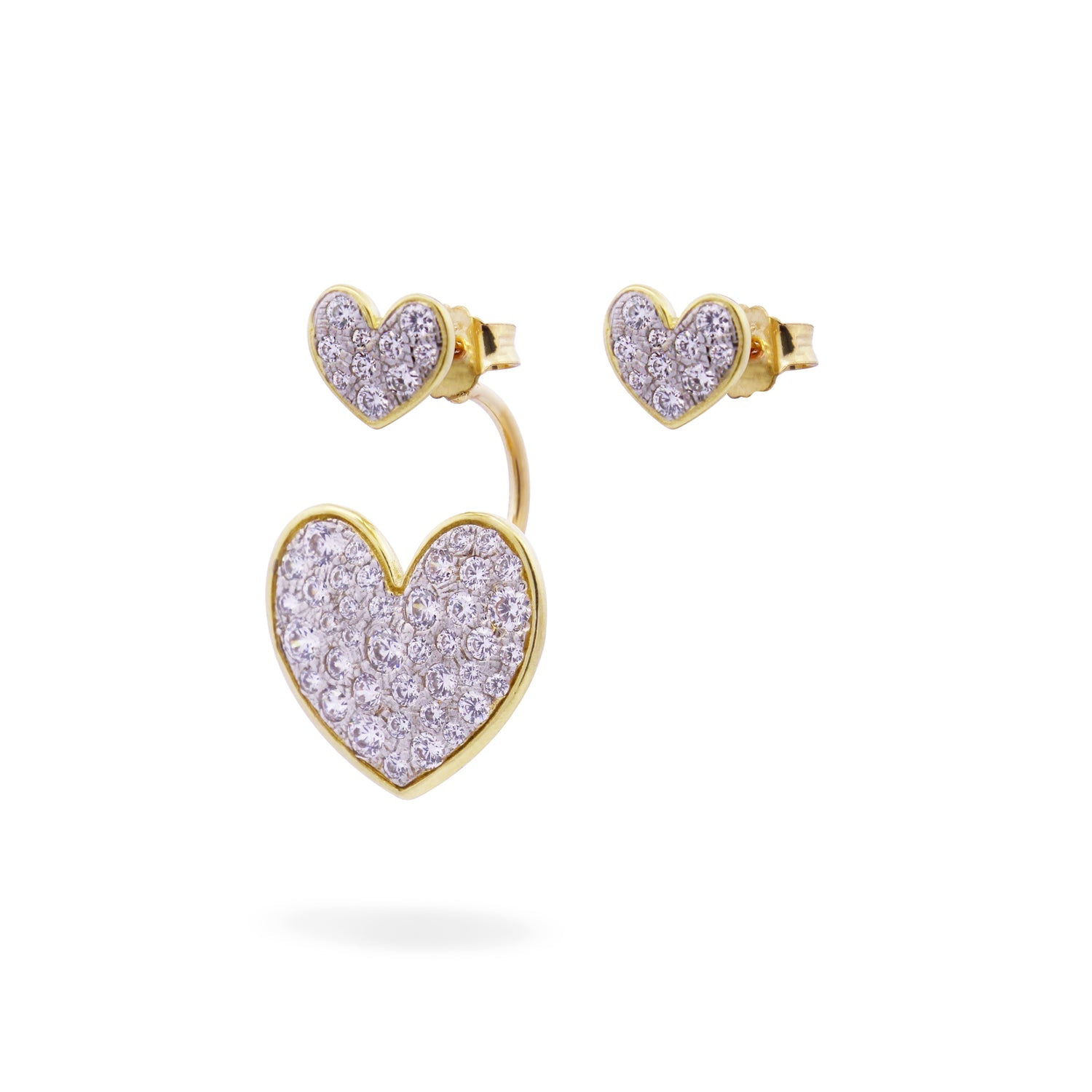 Coppia di orecchini asimmetrici con da un lato un cuore small e un cuore oversized che abbraccia il lobo e dall'altro lato un orecchino a lobo con a forma di cuore misura small.