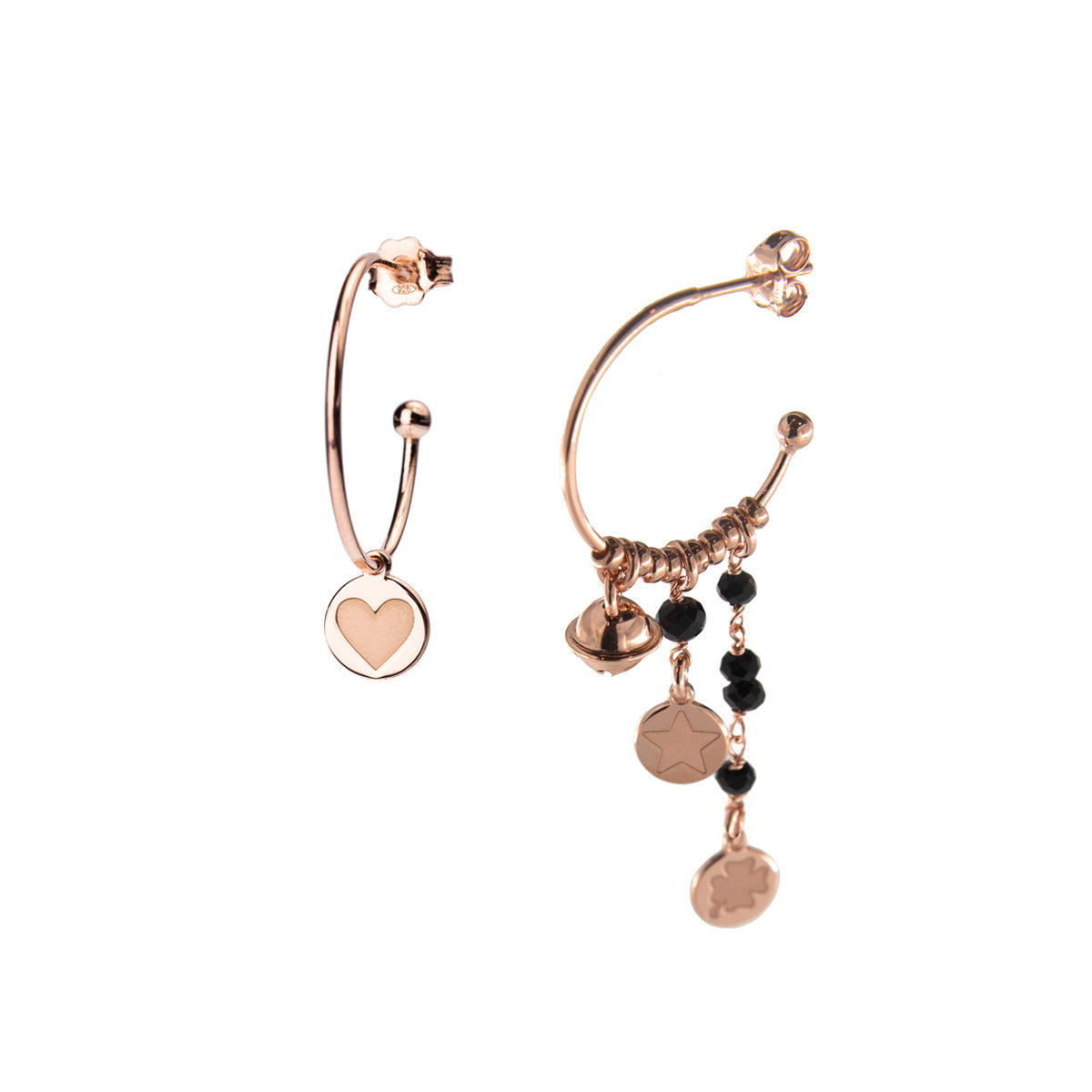 Orecchini vibranti, che fanno subito festa. Una coppia di orecchini asimmetrici con da un lato una cascata di medagliette, campanelli e pietre miste nere, dall'altro lato un cerchio con una piccola medaglia cuore.