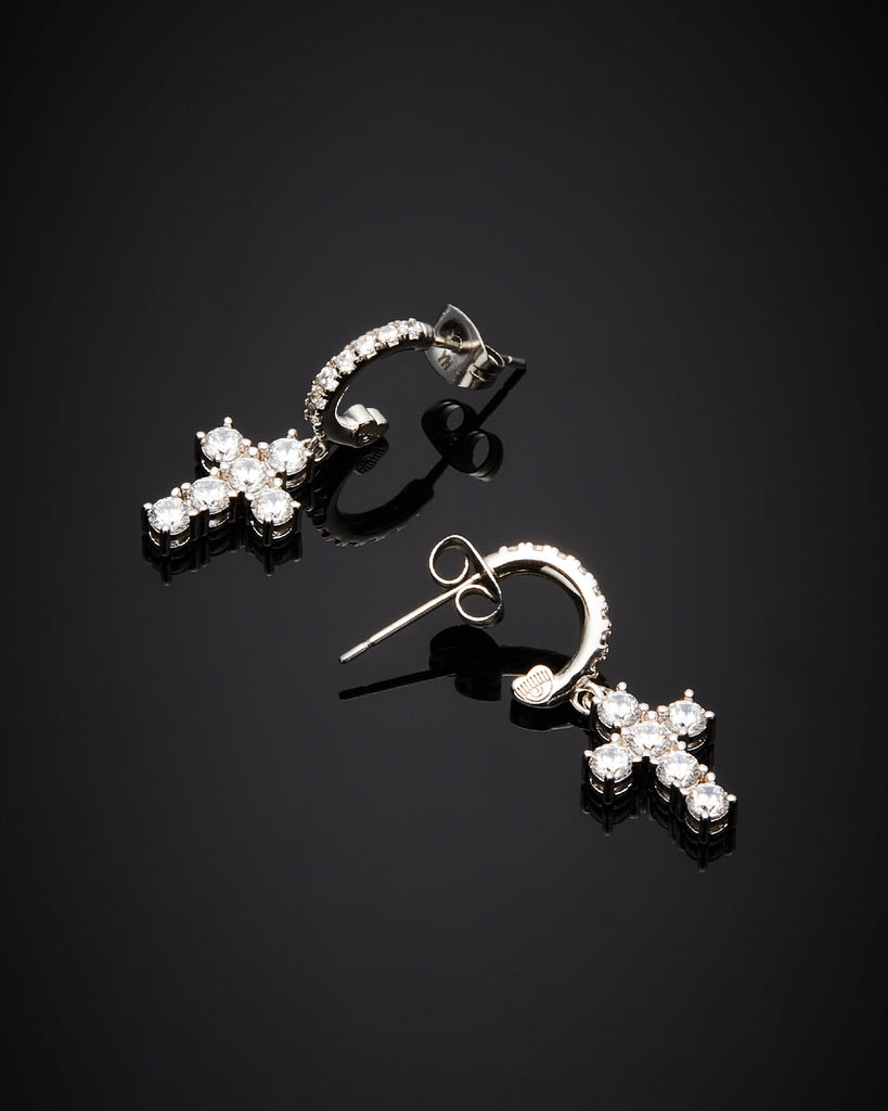 Orecchini pendenti della collezione Chiara Ferragni Croci Bold Cross da donna. Colore: argento. Orecchini a cerchio placcati argento rodiato impreziositi da un pendente a forma di croce con zirconi. Dimensioni croce: 9x12x3 mm (LxAxP), diametro del cerchio: 11 mm. Chiusura a perno.