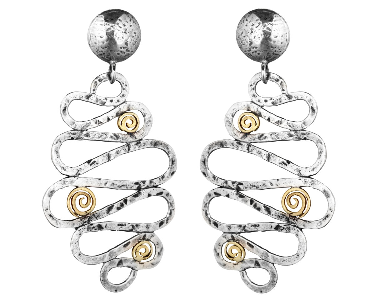 Orecchini argento 925 vortice con spirali piccole in bronzo, chiusura a farfallina. Lunghezza orecchino 5,5cm circa.
