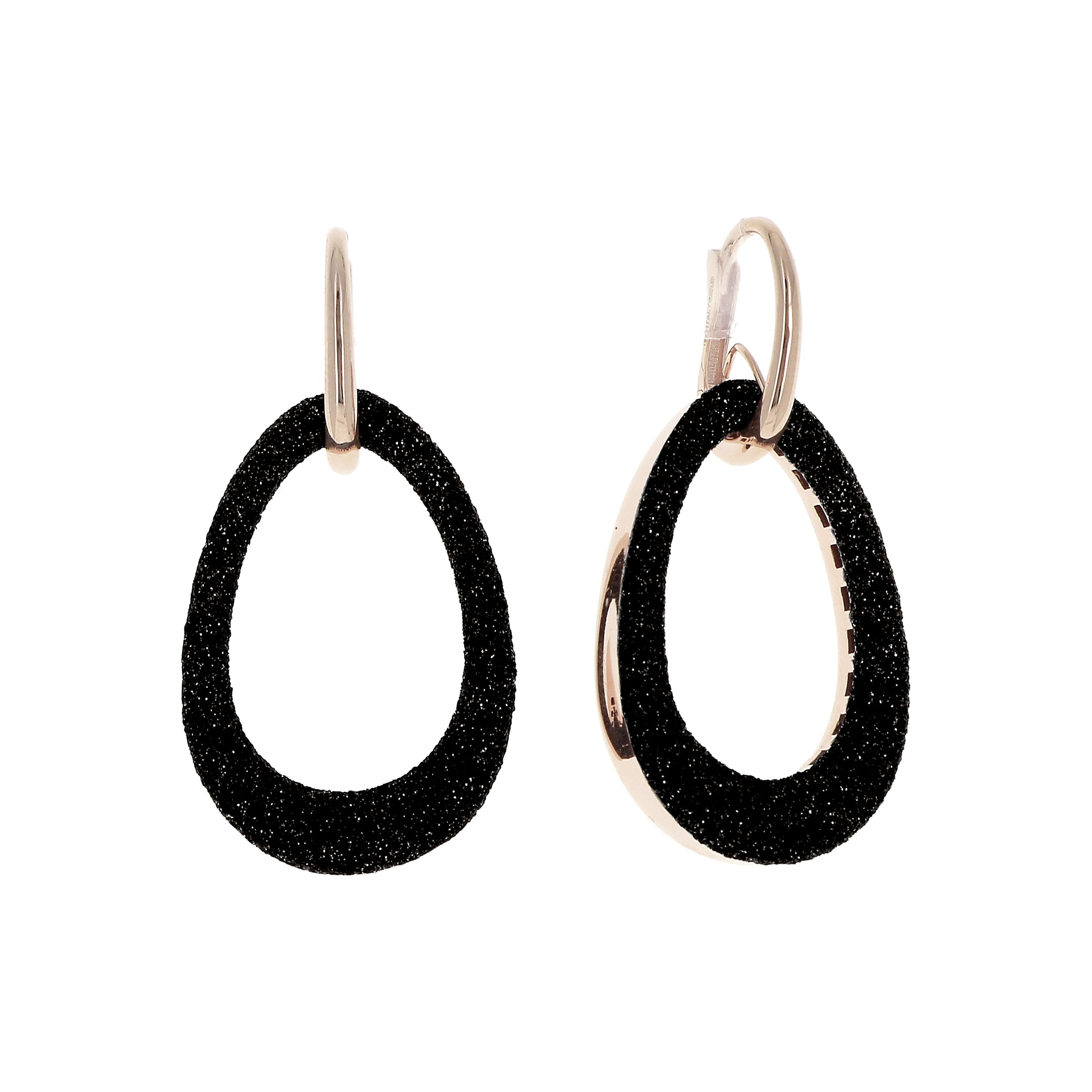 Orecchini pendenti della collezione Pesavento Polvere Di Sogni da donna. Colore: oro rosa e nero. Gli orecchini sono in argento 925‰ rosé caratterizzati da pendenti ovali dal design bombato impreziositi da micro-particelle ottenute, con la nanotecnologia, dalla lavorazione di materiali naturali minerali, a seconda delle caratteristiche e dei colori che si desiderano ottenere, e hanno una forma esagonale per esaltare l'effetto ottico della riflessione. Chiusura a monachella.