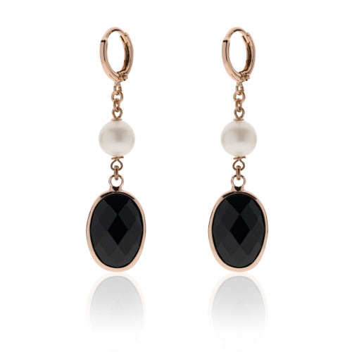 Orecchini pendenti con pietra nera e perle. Chiusura a monachella.