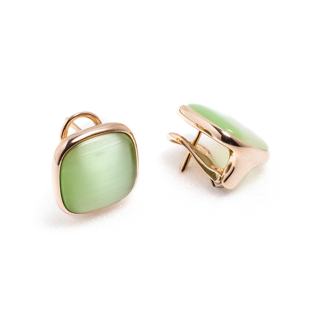 Orecchini a lobo della collezione Laguna di Madì realizzata in argento 925 placcato oro rosa con pietre di quarzo idrotermale di colore verde. Misure orecchino 15 x 15 mm, chiusura a clip