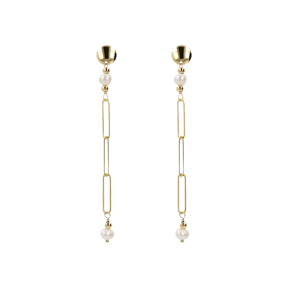 Orecchini pendenti a filo in Oro 375/1000 con catena forzatina allungata e piccole perle bianche tonde coltivate d'acqua dolce; lunghezza 4.5 cm; chiusura a perno e farfalla.