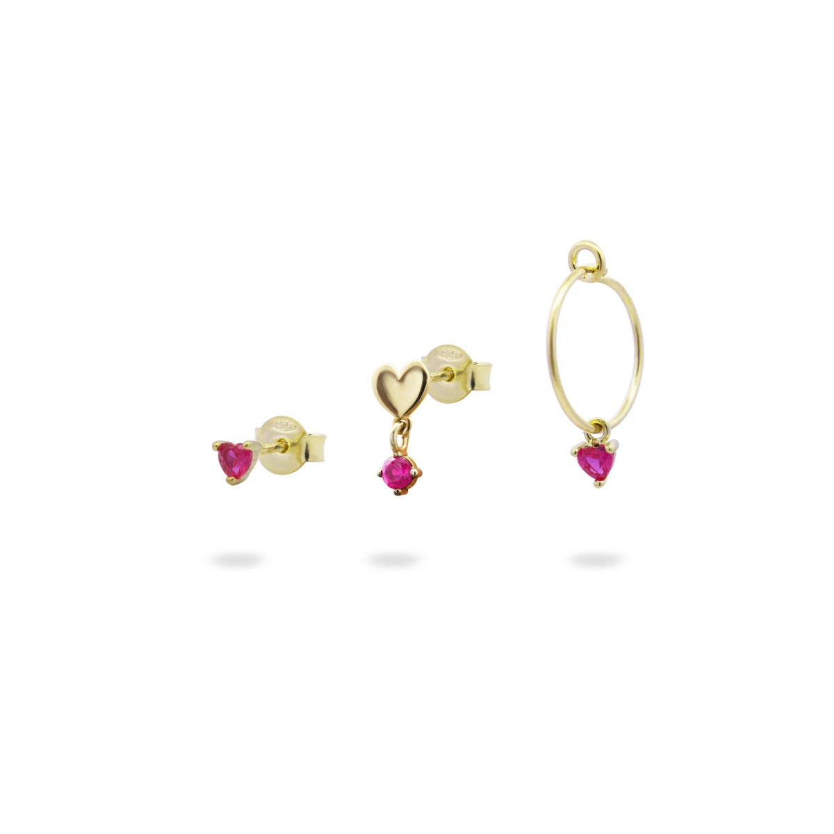 Set di orecchini composto da un cerchietto con goccia pendente, un orecchino a lobo a forma di cuore e goccia pendente in zircone rosso e un orecchino a lobo con cuore tappabuco in zircone rosso