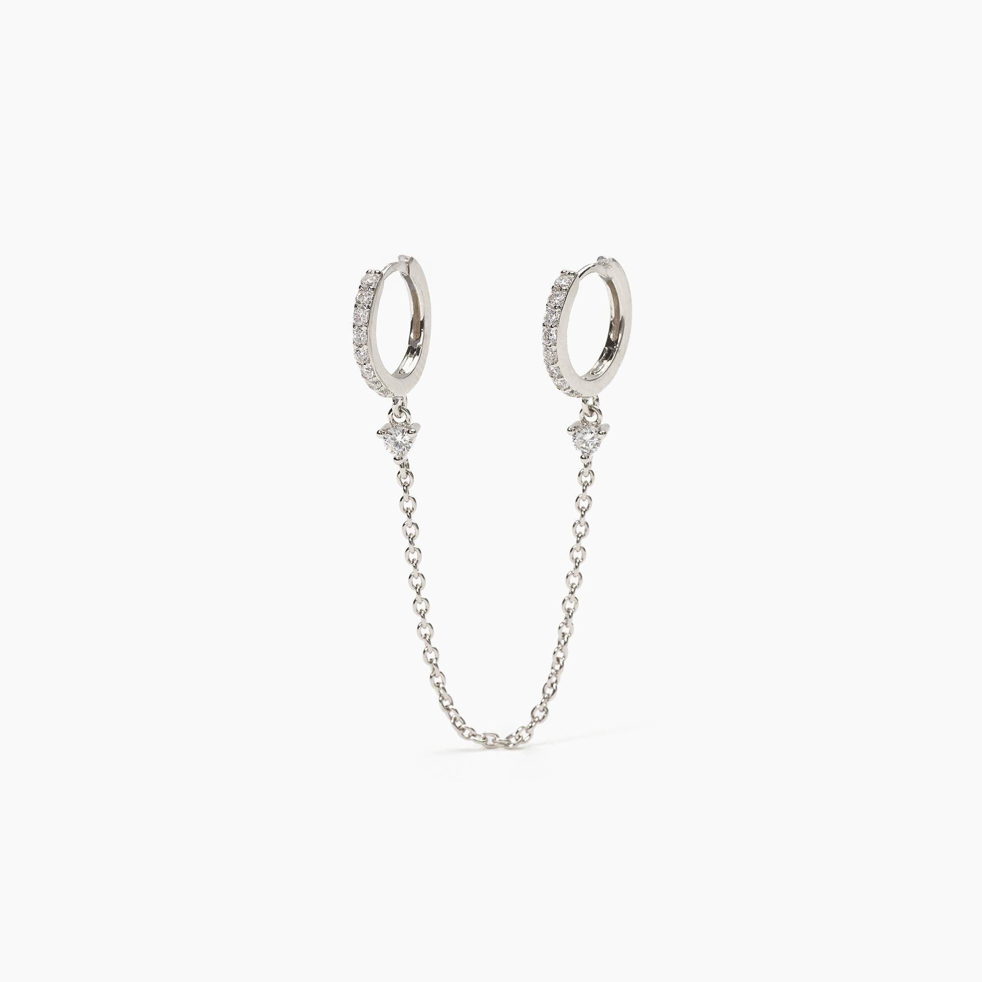 Mono orecchino a due fori in argento con cerchi in zircone e catena.