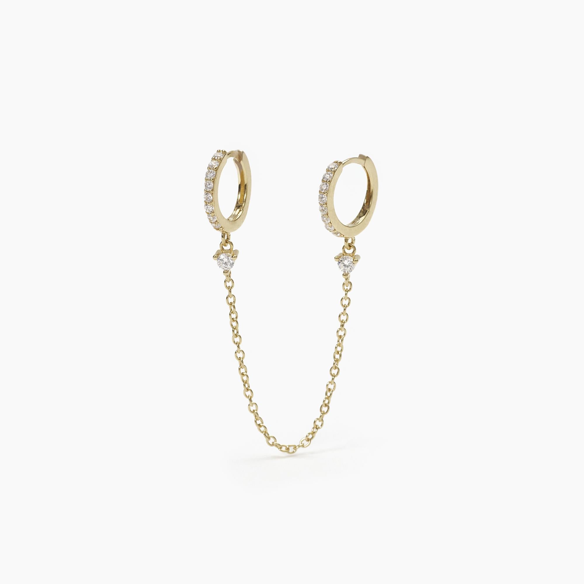 Mono orecchino a due fori in argento placcato oro 18k con cerchi in zircone e catena.