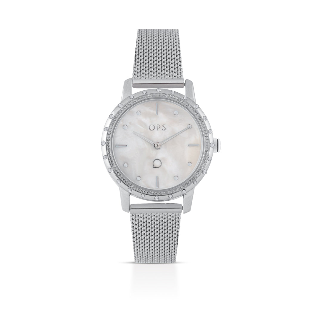 OROLOGIO IN ACCIAIO. CASSA 34 MM CON PIETRE. QUADRANTE MADREPERLA BIANCO.