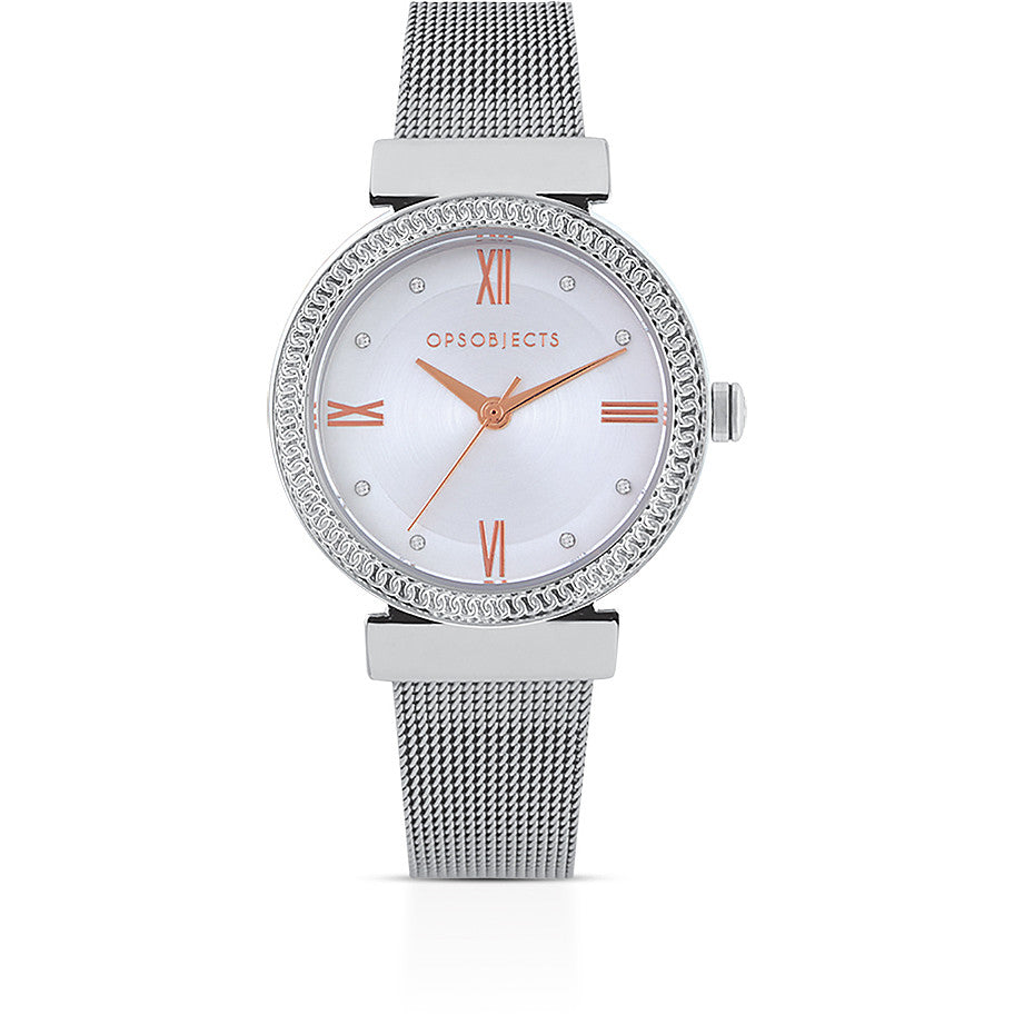 Orologio Solo Tempo Da Donna Di Ops Objects Della Collezione Golden Line. Orologio Con Cassa 34 mm In Metallo, Quadrante Con Numeri Romani E Cristalli E Bracciale A Maglia Milano.