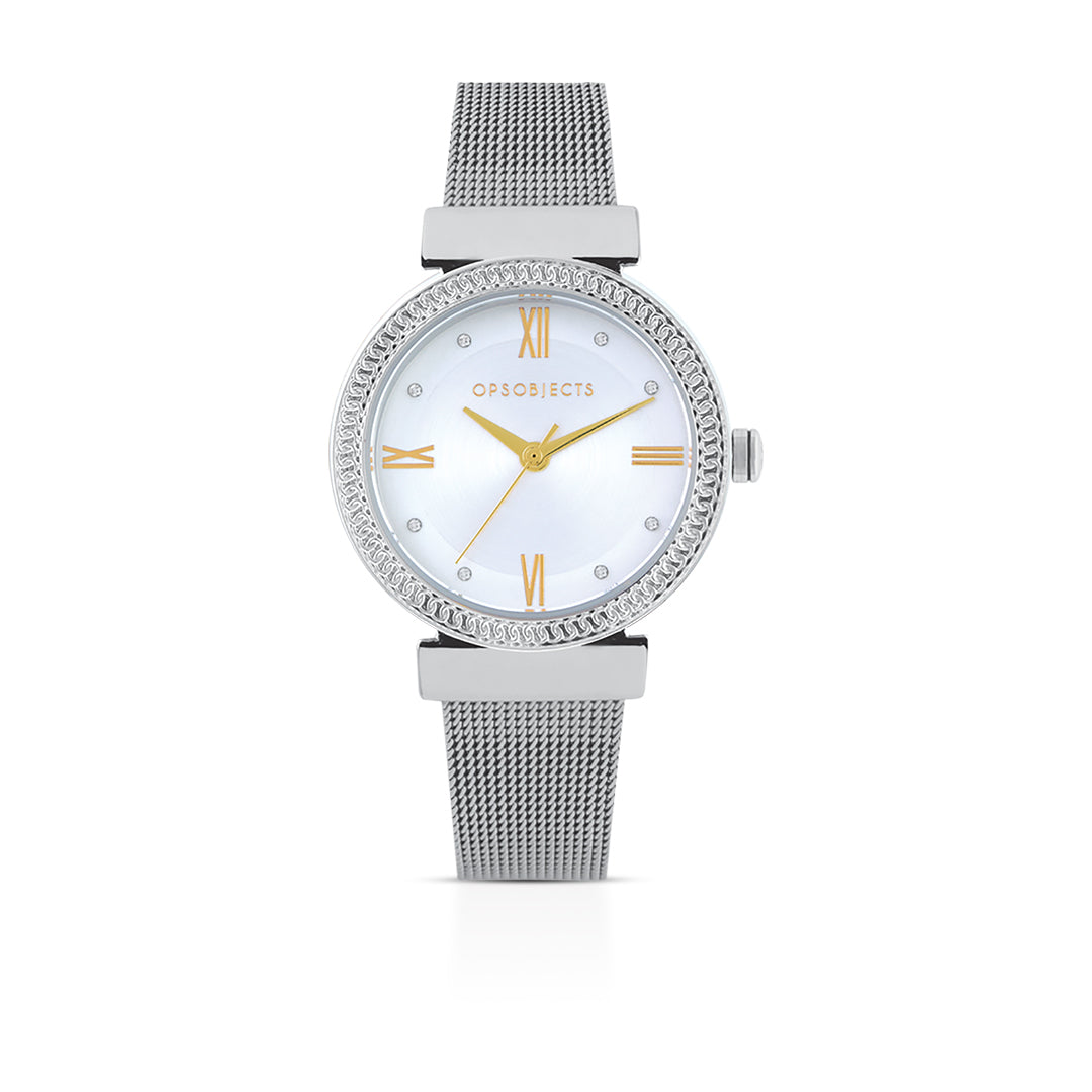 Orologio Solo Tempo Da Donna Di Ops Objects Della Collezione Golden Line. Orologio Con Cassa 34 mm In Metallo, Quadrante Con Numeri Romani E Cristalli E Bracciale A Maglia Milano.
