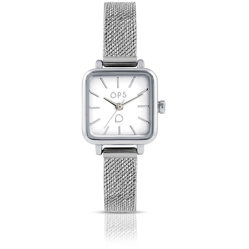 Orologio da Donna Ops della collezione Serious. Cassa in metallo da 22 x 22 mm. Quadrante bianco con indici. Fondello in acciaio. Bracciale maglia Milano diamantata in acciaio.