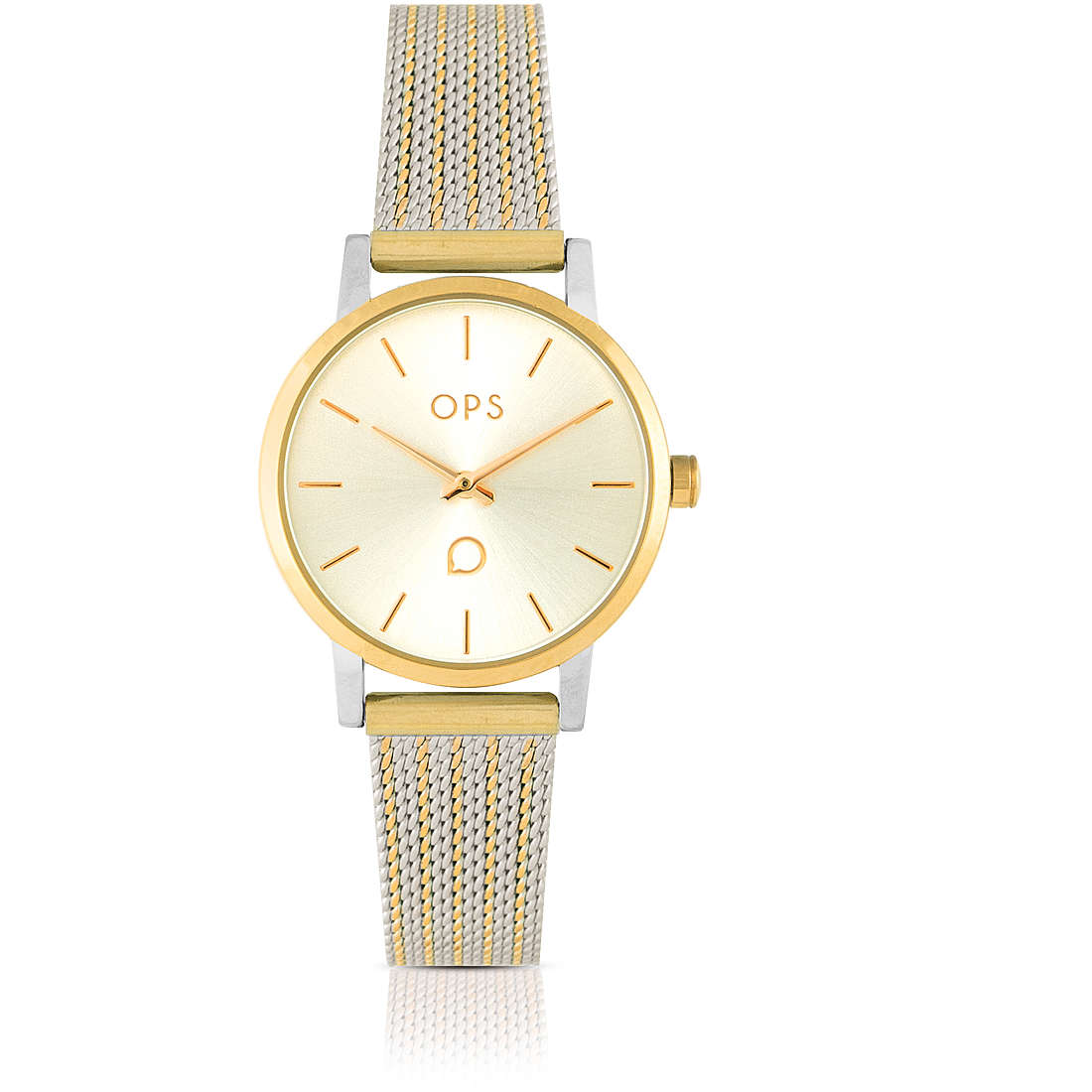 Orologio Solo Tempo Da Donna Di Ops Objects Della Collezione UnconventonIal Love. Orologio Solo Tempo Con Cassa Realizzata In Metallo Color Oro, Quadrante Sunray Con Cristalli, Logo Inciso E Bracciale In Acciaio Color Argento E Oro.