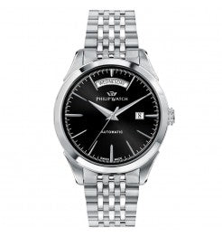 Quadrante analogico nero con indici a bastoni silver e datario a ore 3 con giorno del mese e giorno della settimana nella parte alta. Fondello a vite con movimento a vista. Resistente vetro zaffiro antiriflesso.